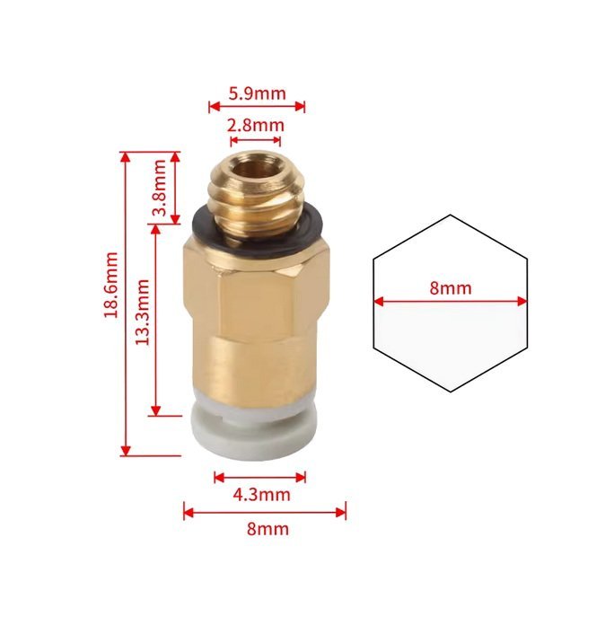 Фітинг KJH 04-M6 призначений для надійного підключення тефлонової (PTFE) трубки діаметром 4 мм до екструдера або хотенда 3D-принтера. Забезпечує герметичне з’єднання та швидкий монтаж/демонтаж без спеціальних інструментів. Ідеально підходить для Bowden-систем і модернізацій 3D-принтерів.