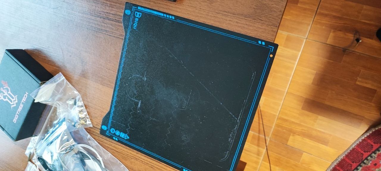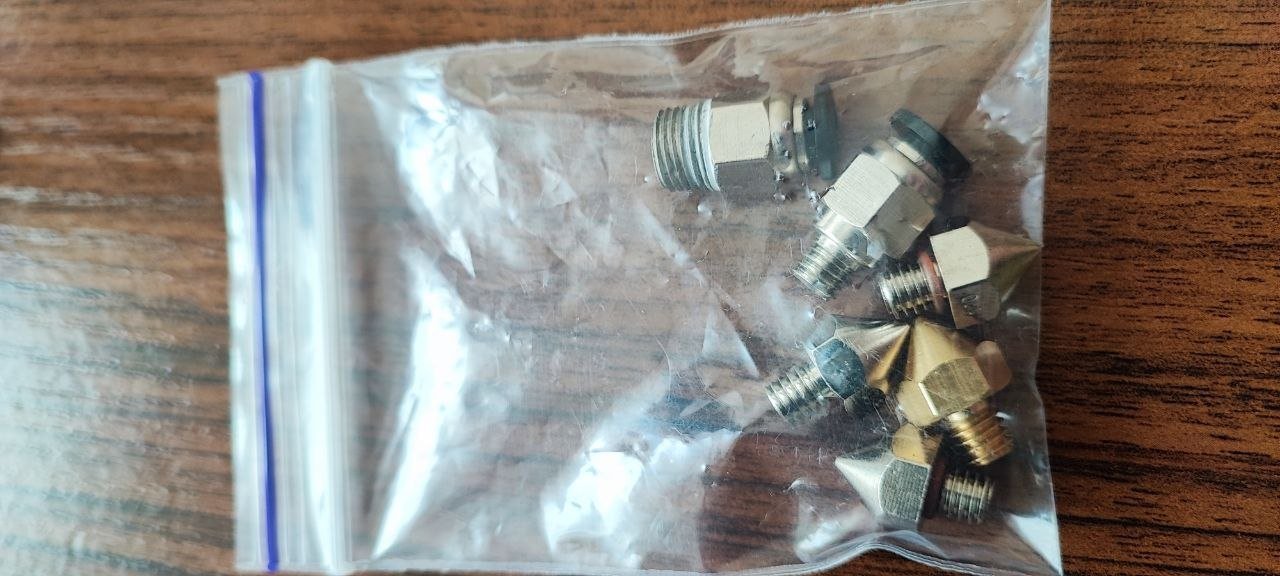В комплекті сам принтер зі всіма дорбками, флешка, набір ключів для обслуговування, інструкція зі збирання та експлуатації принтера, запасні сопла (звичайні та нікельовані, розмір 0.4 та 0.5 мм), дві накладки на стіл (одна оригінальна, трохи подряпана, але нічого критичного, може працювати без проблем, а друга нова (золотиста), зовсім без пошкоджень, одна сторона зовсім не була в експлуатації).